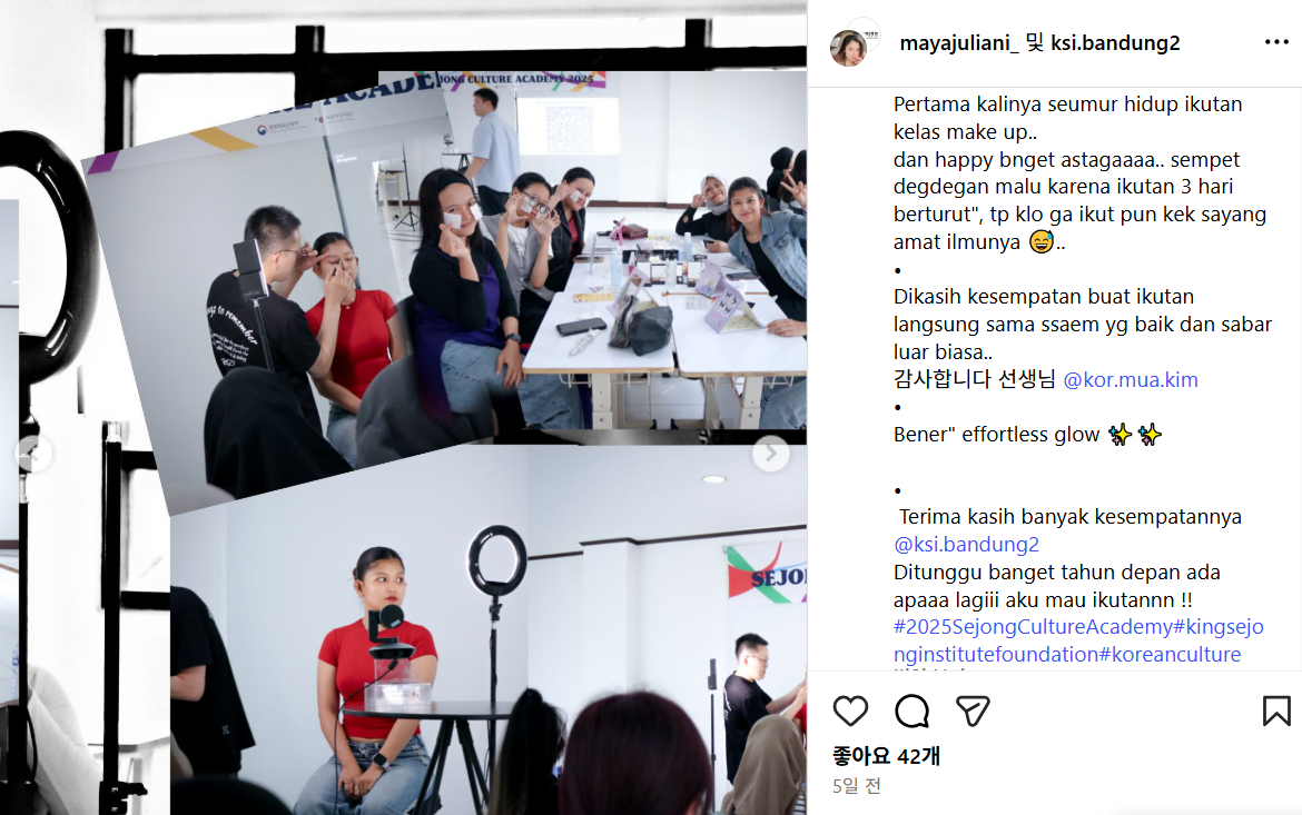 Indonesia King Sejong Institute. Bandung 2 Period 2025.11.19 ~ 2025.11.21 https://www.instagram.com/p/DRXTUZYElL6/?igsh=MjRocm9kOWN1bm4y Comment 0Comment Write Comment List There are no registered comments. Prev King Sejong Institute. Surabaya Next King Sejong Institute. Korean Cultural Center in Philippines List